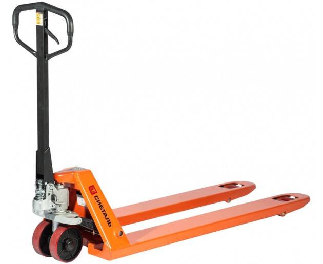 Тележка ручная гидравлическая представляет собой устройство, состоящее из вилочной металлической конструкции, оснащенной колесами для ее перемещения, ручки управления процессом подъема и перемещения, гидравлического узла. Вилы тележки изготовлены из листовой стали методом штамповки.